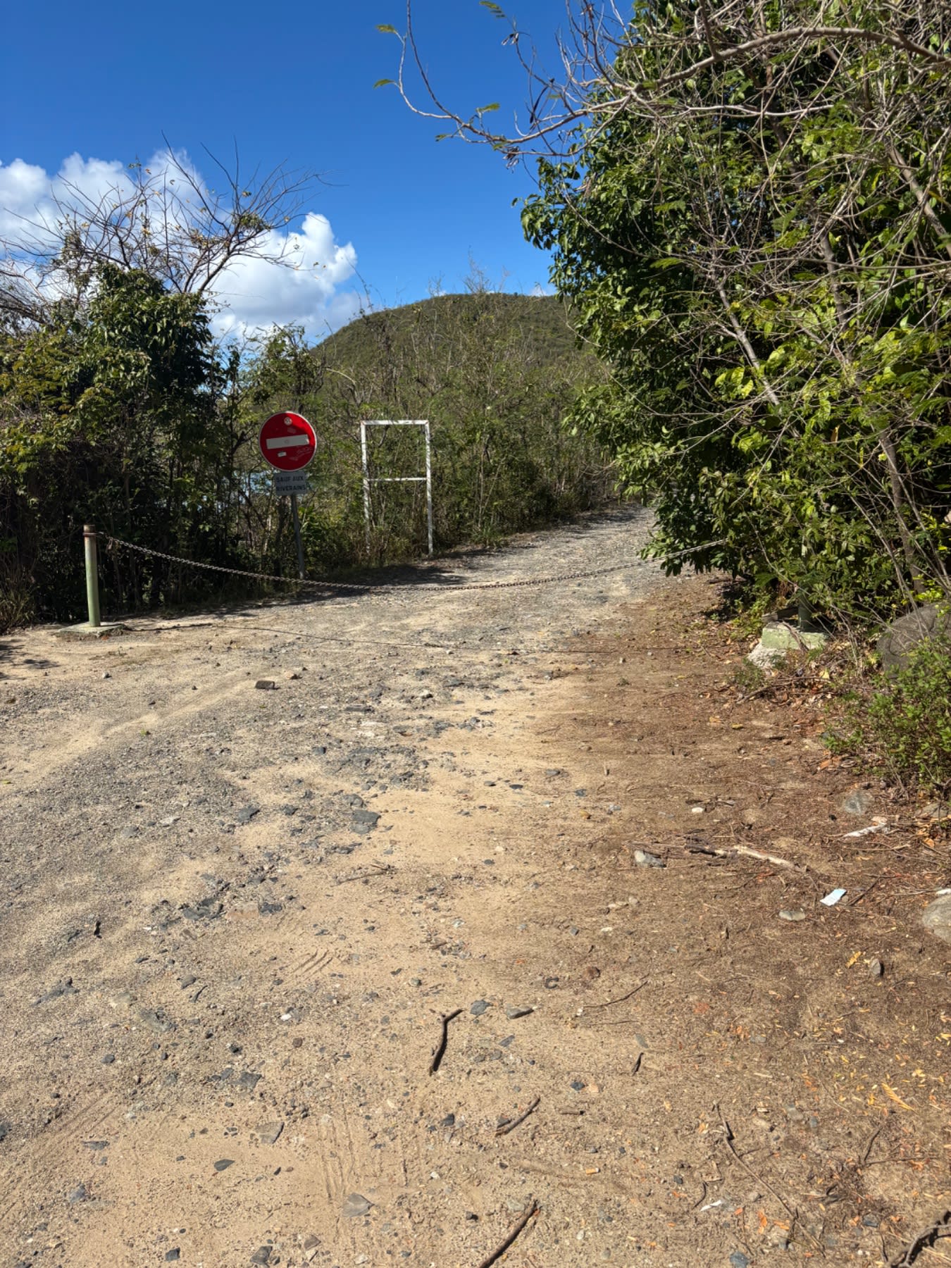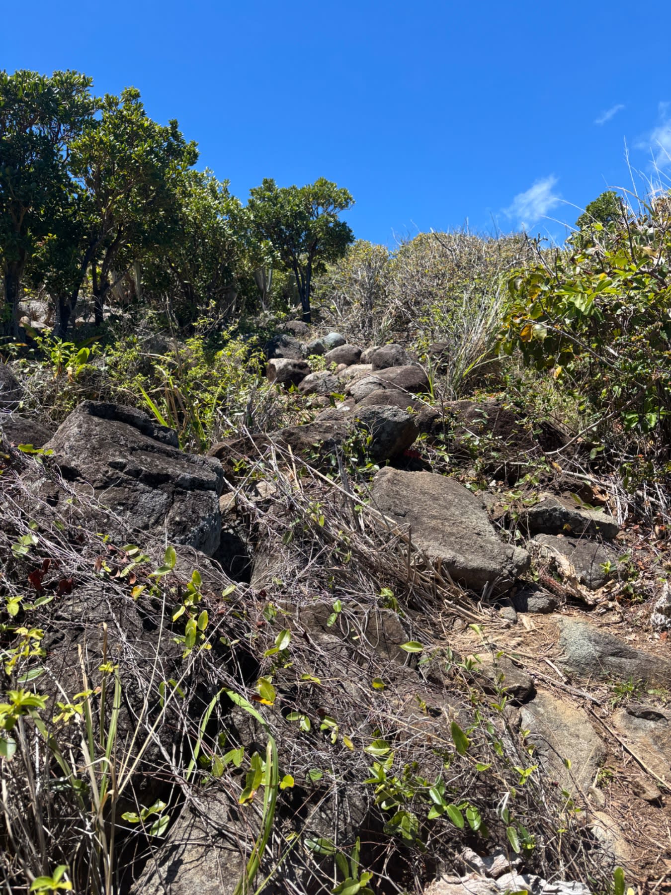Now it gets real. The trail narrows, the canopy closes in, and you're climbing. The path is rocky — think dry rain gully — and lined on both sides with impressive cacti. Watch your hands. Don't grab for handholds without looking first. I learned this lesson. The Conservatoire du littoral has placed plant identification signs along the trail, and if you slow down enough to read them, you'll discover you're walking through one of the most ecologically significant patches of land on the island. Keep an eye out for iguanas and hermit crabs making their own way through the undergrowth.