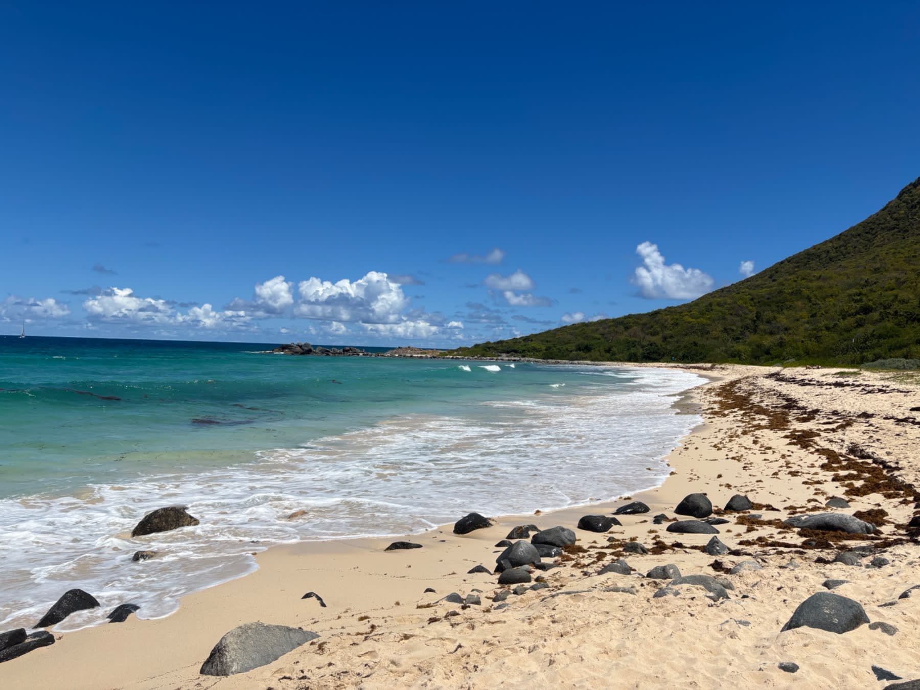 The beach is small, sandy, and almost always empty. The water is that particular shade of Caribbean turquoise that photographs look fake. Waves roll in with enough energy to make swimming genuinely fun, and the rocky point at one end of the beach leads to a series of craggy coves worth scrambling around — especially with Anguilla sitting on the horizon and sailboats drifting past. Perfect selfie territory.