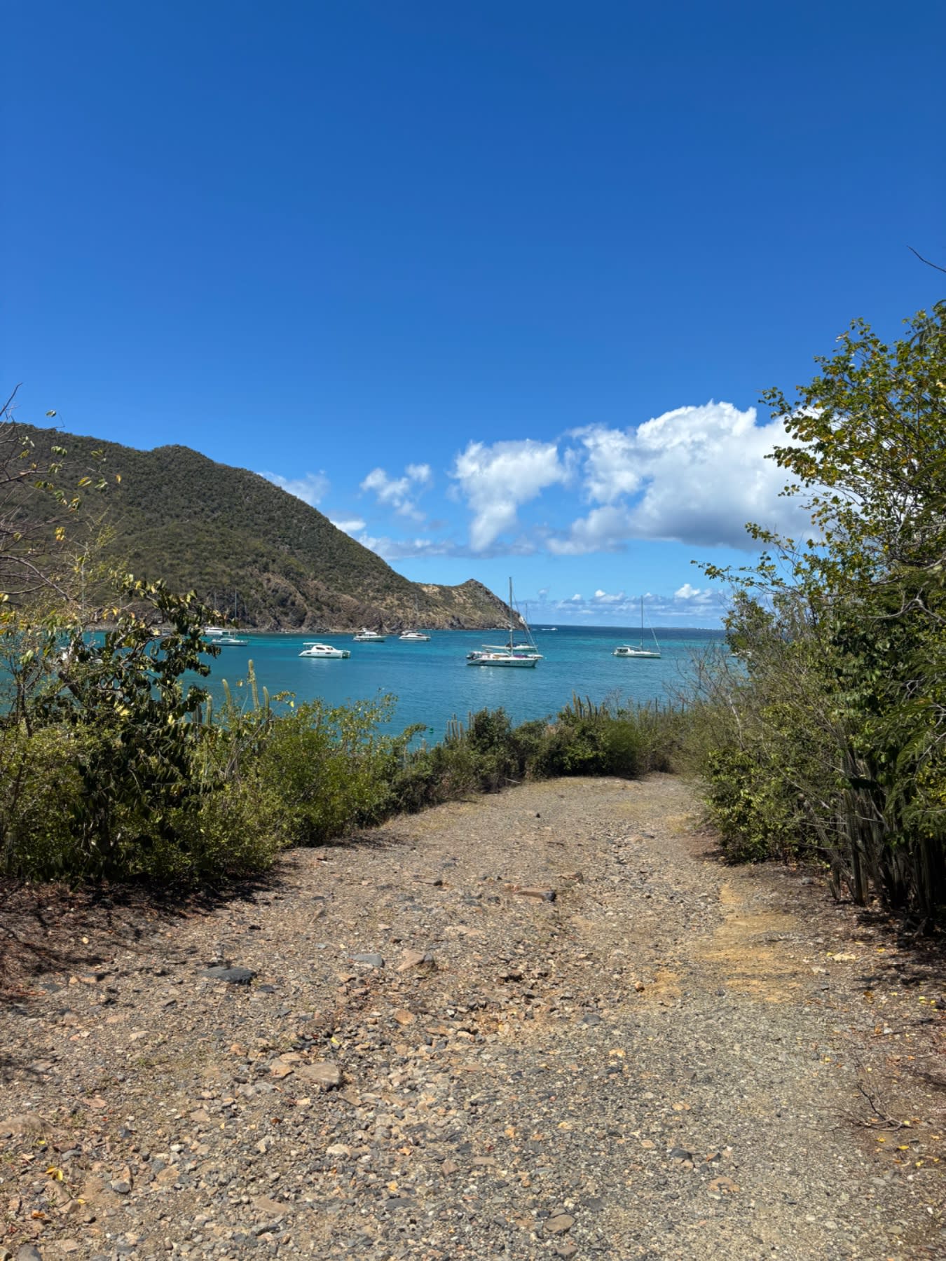 The first 20 minutes or so follow an old double-track road that hugs the hillside above the bay. This section rewards you immediately. To your left, a large marina stretches out below, packed with sailboats belonging to the resort. The views are genuinely beautiful and this is a great spot for your first selfies of the day. You'll know you're heading the right direction.