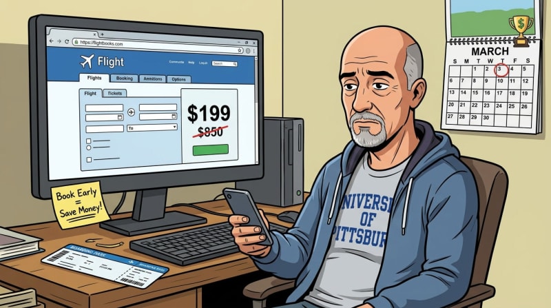 He booked six months early to get the best price. The flight is now two hundred dollars cheaper.